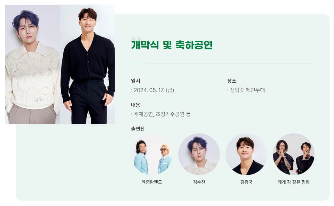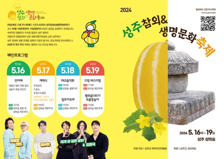 개막식은 5월 17일 금요일에 열립니다. 육중완밴드, 김수찬, 김종국, 레게 강 같은 평화(하하, 스컬)가 2024 성주 참외축제를 빛내줄 계획입니다.