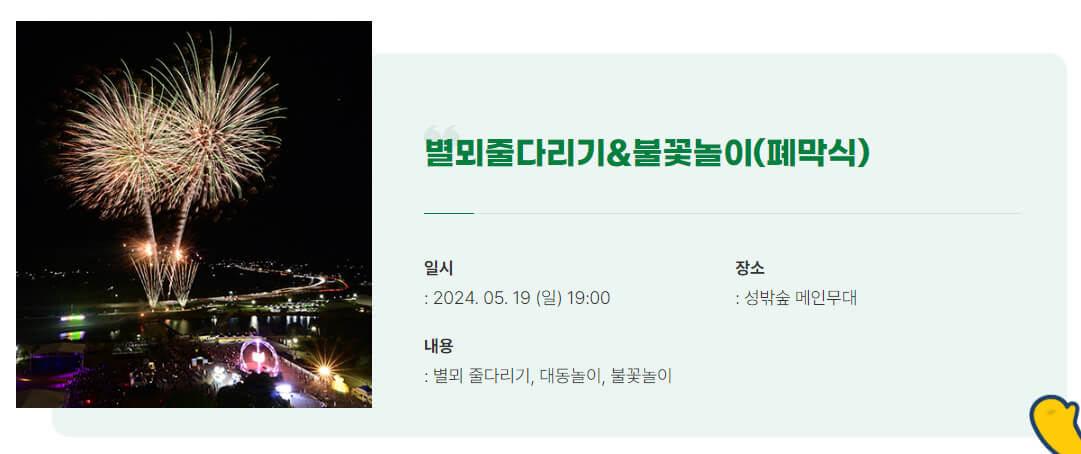 공연이 끝난 뒤, 별뫼 줄다리기와 대동놀이 그리고 폐막식을 불꽃놀이가 장식해 줄 계획입니다. 화려한 불꽃놀이가 준비되어 있으니 꼭 참석하여 불꽃놀이를 구경하고 좋은 시간을 보내면 좋을 것 같습니다.