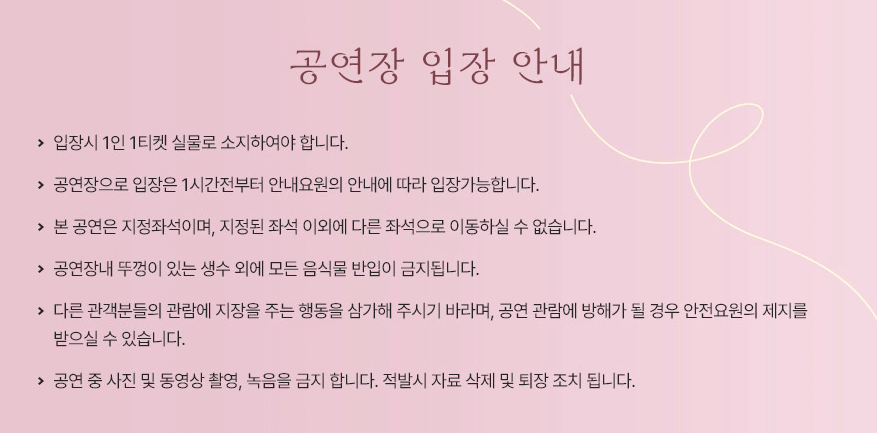 - 관람 수칙을 숙지하지 않은 분쟁으로 인한 변경이나 환불은 불가하니 주의해 주시기 바랍니다.